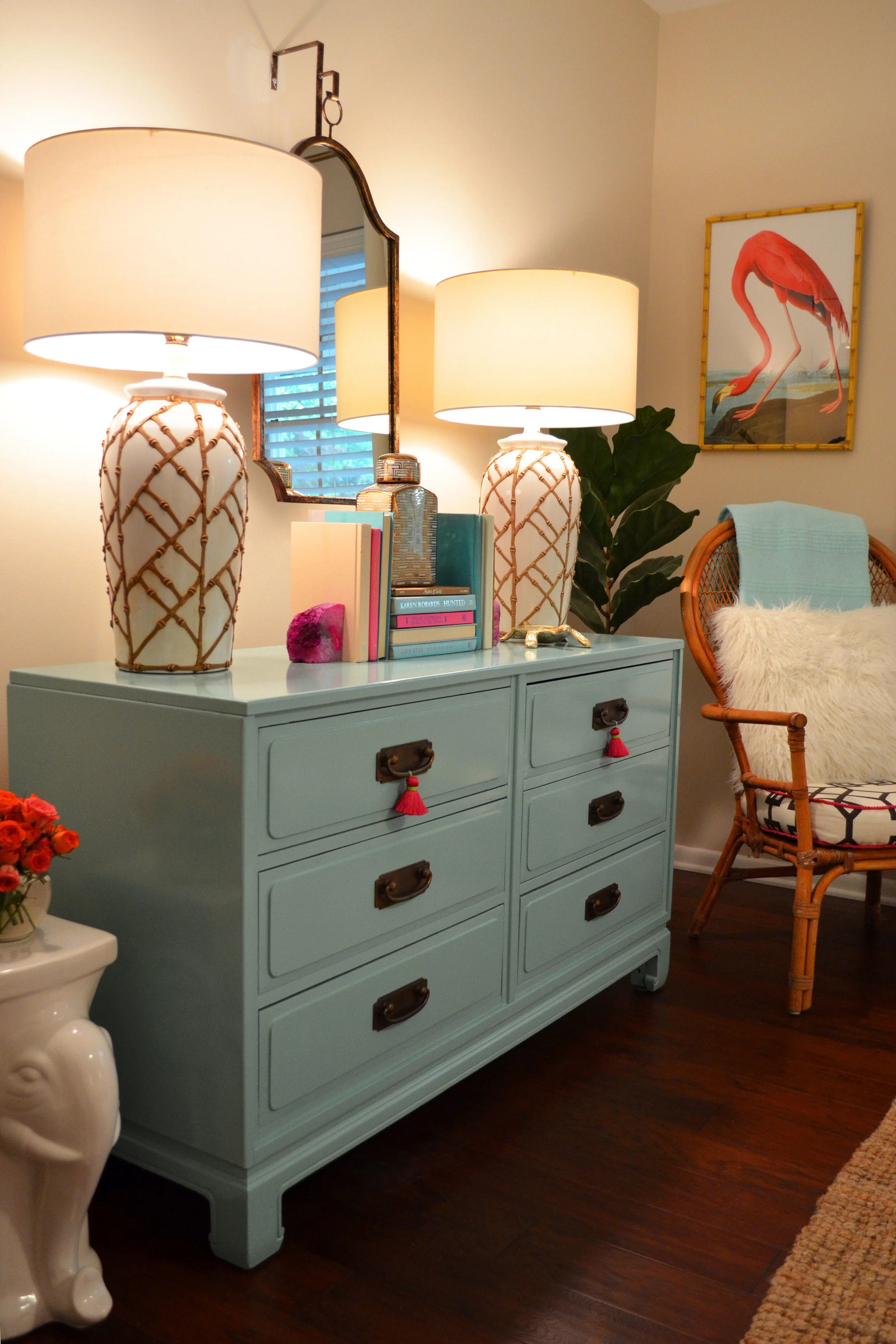 SOURCES: Dresser - Vintage, Local, and Painted at Southern Antiques and Accents // Chair - Vintage and Local at Kaglen's // Lamps - Vintage and Local at Antiques at the Loop // Gold Pouf // Flamingo Artwork // Elephant // Mirror - Local at Antiques at Loop